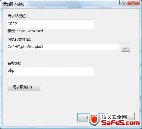 7、在“处理程序映射”里右键“添加脚本映射”,请求路径填*.php,可执行文件还选c:\php\php5ispai.dll,名称还叫php。