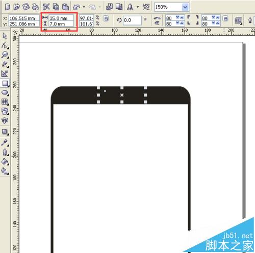 5、在手机的上面中间的位置,用矩形工具,画一个宽为35mm,高为7mm的长方形,并设置长方形的圆角值为100,再填充白色。