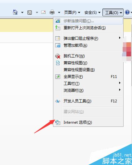 1、打开IE浏览器,点击右上角的【工具】选项,在下拉菜单中找到【Internet选项】点击打开。