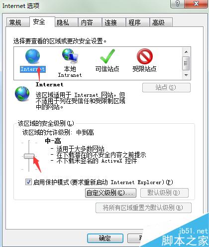 3、进入安全选项界面后,在上方的【选择要查看的区域或更改安全设置】选择Internet,然后查看下方的安全级别是否过高。