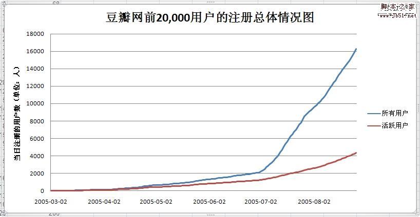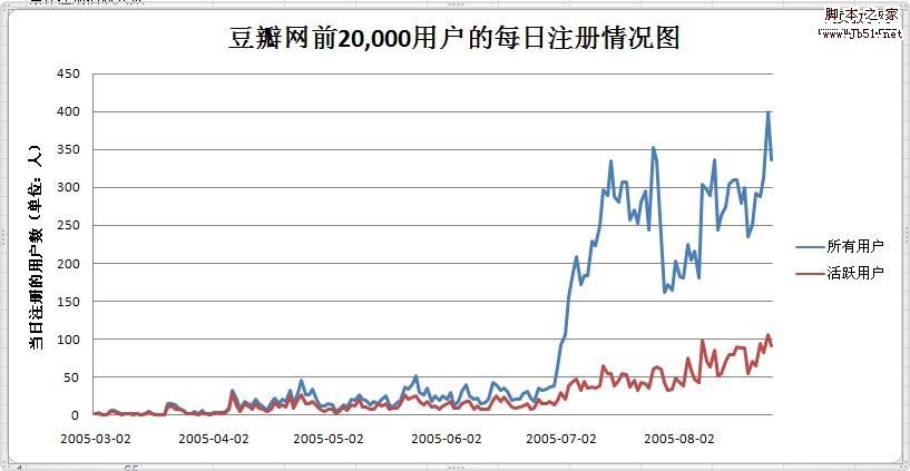 1,第一张图是从2005-3-2到2005-8-27为止的(X轴),每天增加的用户人数(Y轴)。