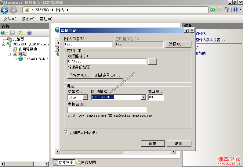 9、如果现在想发发一个网页,那么我先将我的网页文件放好,比如说现在我在C盘里面放一个test的文件夹,然后在里面随便建立一个网页,名字就叫index.htm,然后在IIS控制台里面找到网站,右健,添加网站,在这里,网站名称我输入:test,物理路径就选择我刚才放网页文件的那个物理路径,C盘下的test文件夹,然后在下面的绑定栏里的IP地址我就选择我服务器的IP地址192.168.10.1,在点确定就可以了,test站点建立好后,有可能发现test这个站点无法使用,上面打了一个叉,没关系,将这个站点重新启动一下就可以了(选中这个站点,右健,管理网站,重新启动)