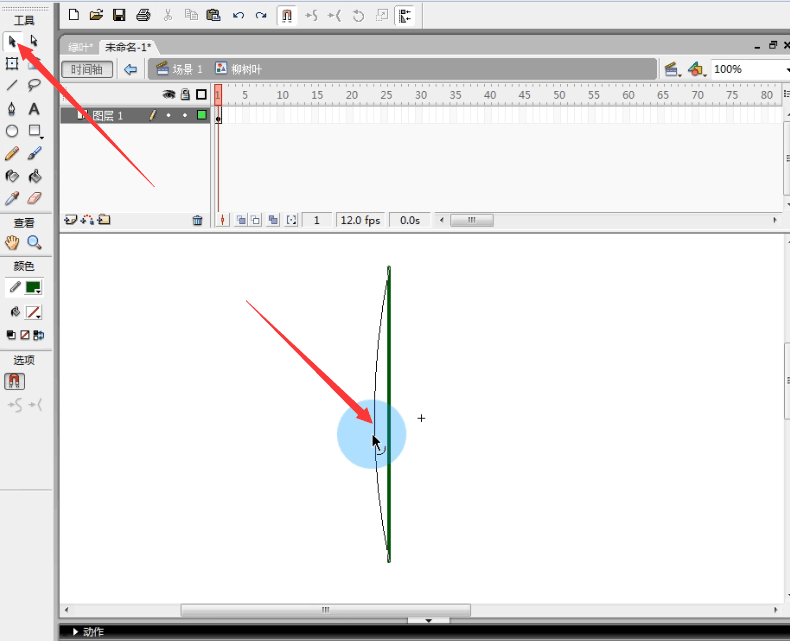 5、然后我们回到场景将制作好的柳树叶拖到舞台。选择任意变形工具将柳树叶的中心点拖至到柳条儿的尾部。再将整个柳树叶压扁一些。