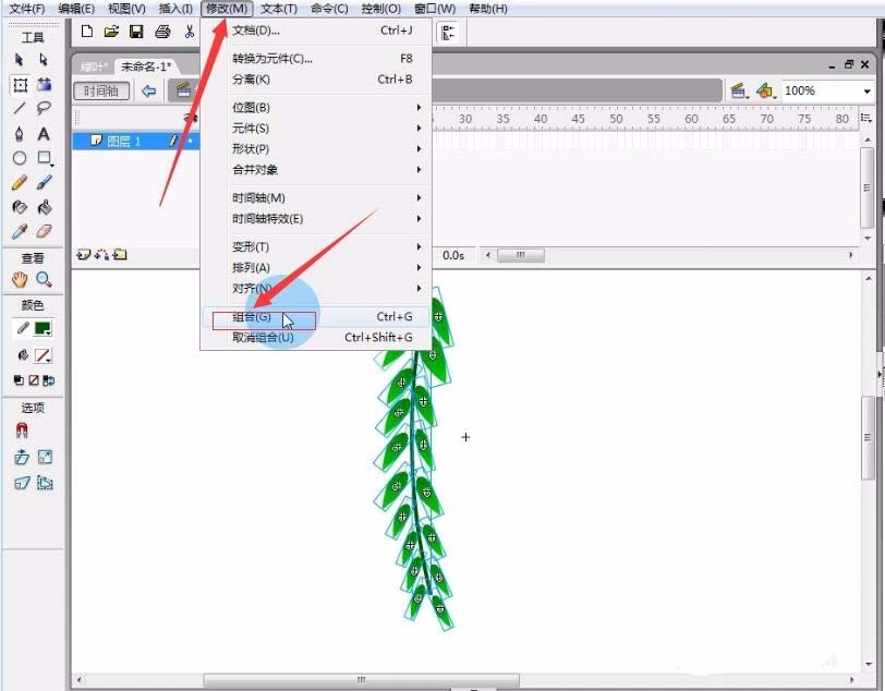 3、调出之前做好的树叶图形元件,将它拖入到舞台,点击任意变形工具,将它变形拖至与线条匹配的叶子大小。将树叶儿安置在线条上。