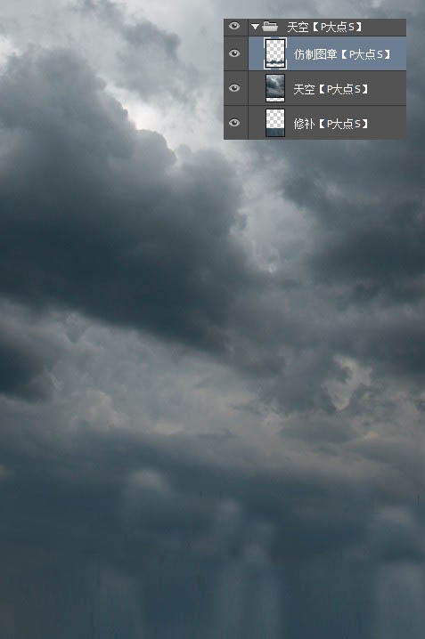 4、接下来,我们来把天空上的建筑修掉,新建一个图层,我将其命名为“仿制图章”,置于“天空”图层的顶层,使用“仿制图章”工具,使天空融合在一起,不用太过精确,差不多就可以了。