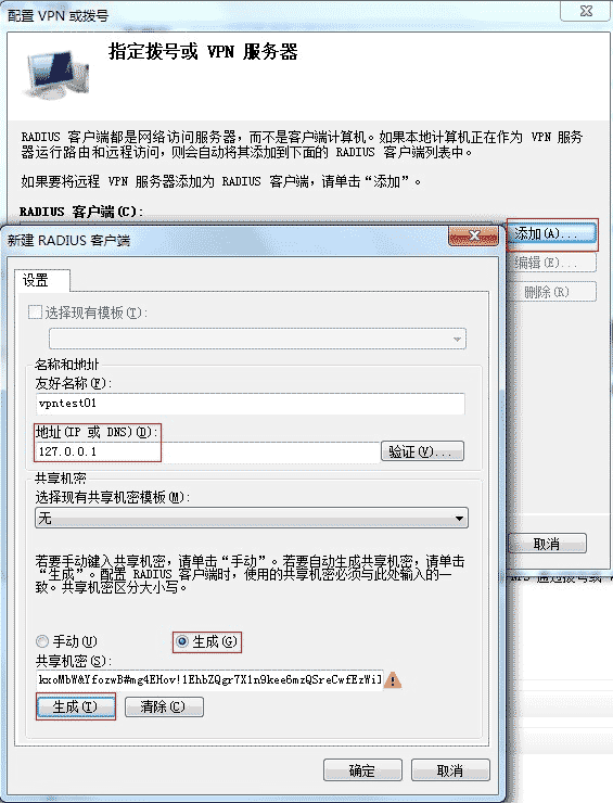 添加一个RADIUS客户端,取个友好名称,地址就本地IP吧,然后生成一个共享机密,当然手动输入也可以。这不是密码。