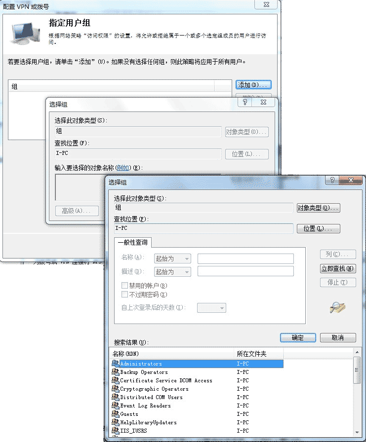 这里解释下,我们选择了MS-CHAPv2认证,那么我们需要指定授权给VPN拨入的用户组。我这里添加了Administrators和Users组。最好是新建一个组专门用于VPN接入,不过这里简略点就用了现成的用户组。