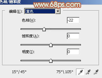 3、创建色相/饱和度调整图层,对黄、绿,蓝进行调整,参数设置如图6 - 8,效果如图9。这一步把图片中的黄色转为中性色,绿色转为较淡的黄绿色,蓝色则转为青色。