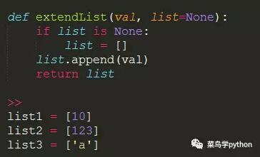 许多人会错误的认为 list1 应该等于 [10] 以及 list3 应该等于 ['a']。认为 list 的参数会在 extendList 每次被调用的时候会被设置成它的默认值 []。
