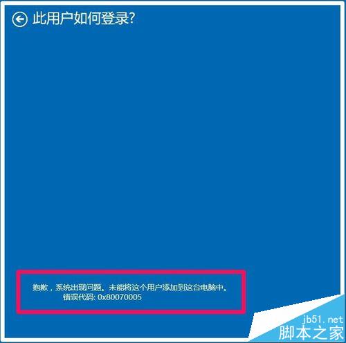 5、但是,在我们点击下一步后,出现错误提示:抱歉,系统出现问题。未能将这个用户添加到这台电脑中。错误代码:0x80070005。试了几次都 不行,没有办法,点击:取消;
