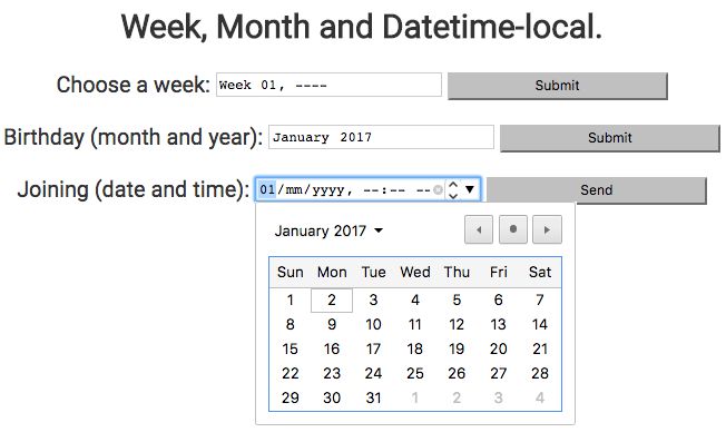 正如其名称所表明的,头两个元素可以让用户选择一个星期值和一个月份值。根据浏览器的支持情况不同,它们俩都会被渲染成一个下拉显示的日历,让你可以选择一年中一个特定的星期或者月份。
