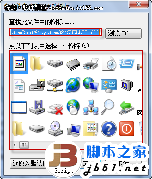 在“为文件夹图标更改图标”的对话框中我们会看到正在使用的图标文件路径,以及Win7为用户默认可选的文件图标样式。