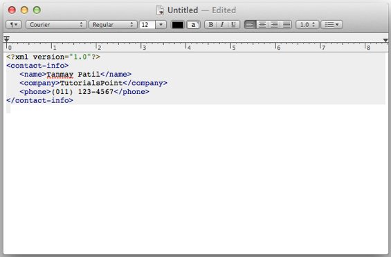 任何简单的文本编辑器,比如 Notepad,Textpad 或者 TextEdit 都可以用来创建或查看一个 XML 文档,如下所示: