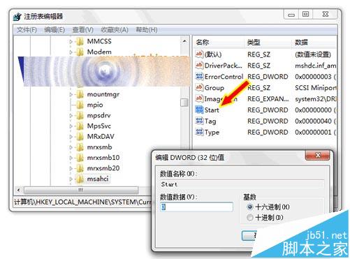 2.在“注册表编辑器”窗口左侧标题栏定位至HKEY_LOCAL_MACHINE\SYSTEM\ CurrentControlSet\services\msahci分支,然后在右侧窗口,双击“Start”。