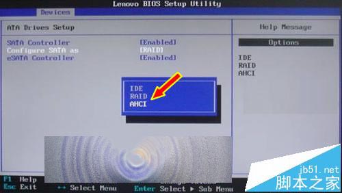 5.重新启动电脑时进入BIOS设置界面,将硬盘更改为AHCI模式。例如,针对笔者电脑而言,启动电脑时按F1键进入BIOS,依次选择Devices→ATA Drives Setup→Configure SATA as→AHCI(如图3),最后按F10键保存并退出BIOS。