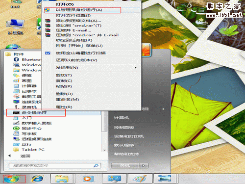 点开始--所有程序--附件--命令提示符,右键点“命令提示符”,在菜单中选择“以管理员身份运行(A),如下图: