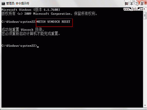 3:输入 netsh winsock reset 后回车(命令不区分大小写,另之后有可能会提示错误:10107,但不用管提示,直接关闭窗口即可):