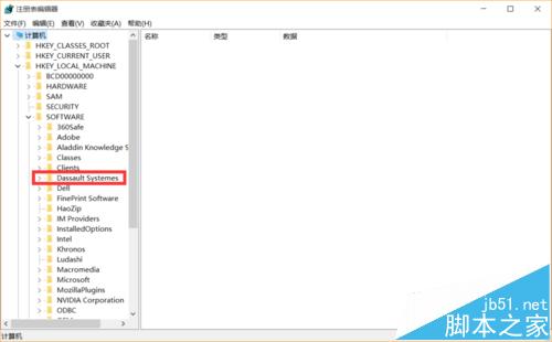 4、徽标键win+r,弹出窗口输入regedit,由此打开了注册表编辑器,定位到计算机-HKEY_LOCAL_MACHINE-SOFTWARE-Dassault Systemes,将Dassault Systemes删除。