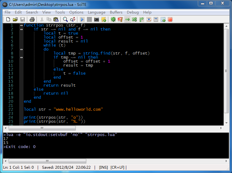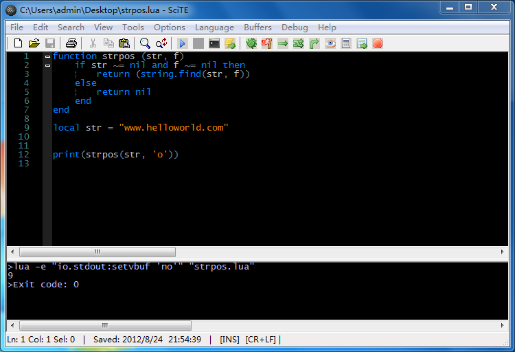 在来写一个lua中实现php的strpos()函数,查找某个字符串在指定字符串首次出现的位置,其实lua中也为我们提供了这样的函数使用string.find()即可获得,下面我们还是简单写一个函数,代码如下: