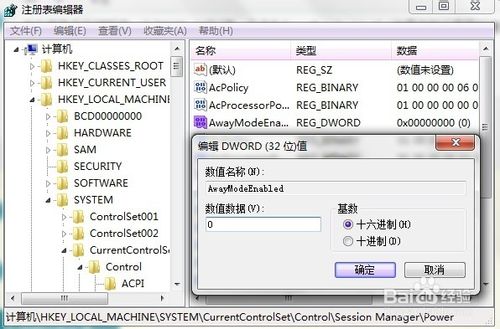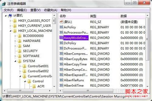 2依次打开注册表的HKEY_LOCAL_MACHINE\SYSTEM\CurrentControlSet\Control\Session Manager\Power 找到“AwayModeEnabled”选项