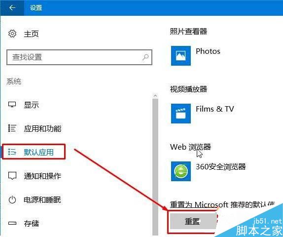 2、在左侧点击【默认应用】,然后在右侧拉到底部,点击【重置为Microsoft 推荐的默认值】下面的【重置】按钮;
