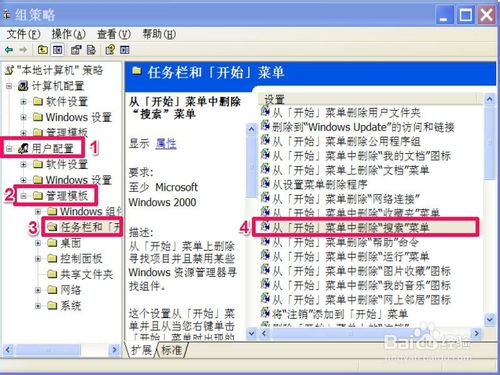 4,进入组策略窗口,按“用户配置”->“管理模板”->“任务栏和[开始]菜单”此路径,找到右侧的“从[开始]菜单中删除“搜索”菜单”这一项,双击。