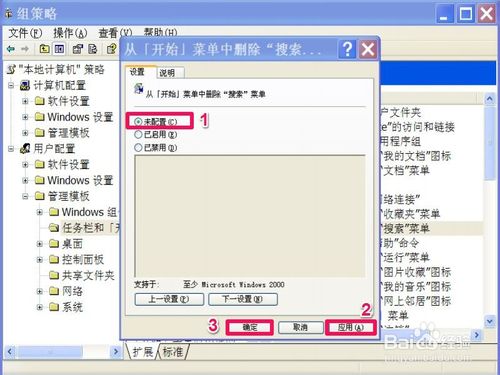 6,要想恢复开始菜单中的“搜索”,需要修改这里,把“已启用”改为“未配置”这一项,然后按“应用”,再按“确定”。搜索就能在开始菜单中显示了。