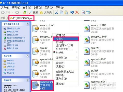 8,在这个文件夹界面,拖动右侧的滚动条,找到srchasst.inf这个文件,右键,选择“安装”,即可把“搜索”功能安装上。