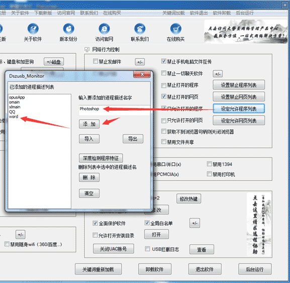 目前国内有很多这样的电脑安全管理软件,例如有一款“大势至USB控制系统”(下载地址:http://www.grabsun.com/monitorusb.html),是一款禁止USB存储设备、禁用U盘的软件,可以实现禁止电脑随意安装软件,在电脑上安装完毕之后,选择右侧的“只允许打开的程序”,然后将工作中常用的程序名字加入进去,则就只让这些程序运行了,除此之外的任何程序都无法运行,自然也无法安装了。如下图所示: