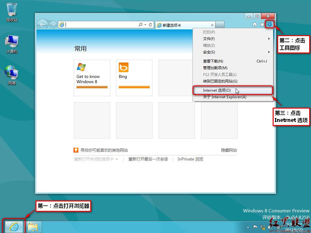1、点击屏幕左下角IE图标,打开浏览器,在IE右上角位置打开小齿轮图标,点击选择“Internet 选项”。