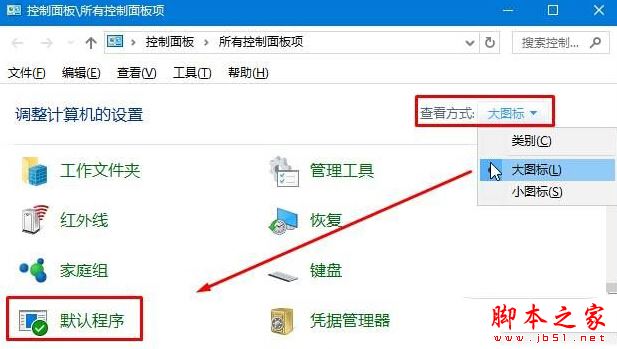 2、将控制面板的“查看方式”设置为“大图标”,在下面点击“默认程序”;