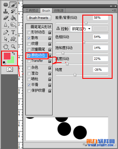 新建一个图层,选择画笔工具,这里我们使用圆形画笔,设置如图参数