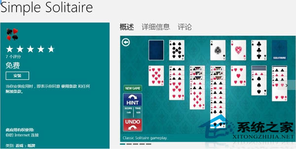 1、进入Win8的应用商店Windows store,搜索到纸牌,就可以看到该应用,下载后就可以玩了。