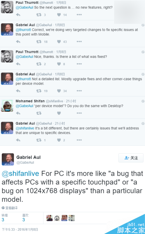 微软之前曾说过,之所以没给出所有修复内容,就是因为过于繁杂,而且很多内容没有普遍性,都是一些相对个别的问题。现在微软Windows Insider负责人Gabriel Aul在Twitter上解释了Win10 Mobile和PC版修复内容的差异,其中Mobile版会更有针对性的解决某些型号设备的问题,而PC版更倾向于解决共性问题。