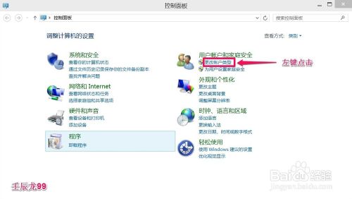 在控制面板窗口,我们左键点击:用户帐户和家庭安全项下的更改帐户类型;