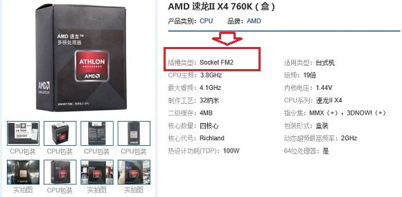 CPU散热器怎么选才能确保兼容呢?这个主要需要取决CPU的插槽类型,我们以AMD 760K处理器为例,可以通过查询处理器的插槽类型,我们可以看到,760K采用的是Socket FM2插槽,如下图所示: