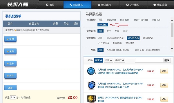 另外在京东自助装机平台中,在选择散热器的时候还可以直接根据CPU插槽类型筛选匹配的CPU散热器,这可以大大方便小白朋友,选择兼容适配的CPU散热器,如下图所示:
