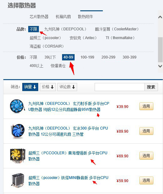 其实一般而言,目前选择CPU散热器,主要还是看CPU性能档次的高低,如果是低端低价CPU,由于本身发热并不大,我们一般选择的是对应低价CPU散热器即可。比如AMD 760K四核处理器定位中低端,其盒装CPU售价425元,而其散装CPU售价为360元左右,因此实际在选择AMD 760K处理器的散热器时候,预算一般在425-360=65元左右。然后我们同样可以借助京东自助装机的平台散热器的价位帅选功能去选择CPU散热器,如下图所示: