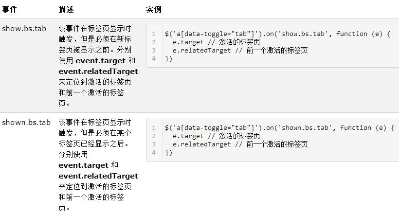 下表列出了标签页(Tab)插件中要用到的事件。这些事件可在函数中当钩子使用。