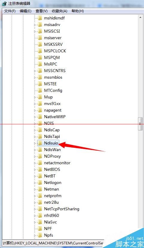 3、进入注册表,定位到【HKEY_LOCAL_MACHINE\SYSTEM\CurrentControlSet\services\Ndisuio】项下