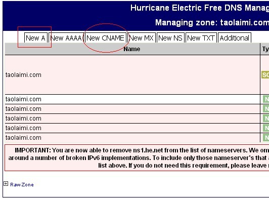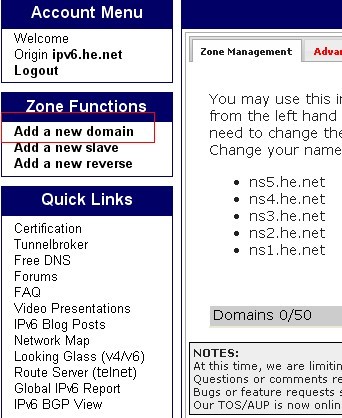 然后如图点击add a new domain添加域名,he.net一个账户最多添加50个域名。