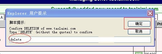 5:如果要删除解析记录,或者删除域名等,如图点击最右边的红色符号,再输入delete,点击确定,就删除了。