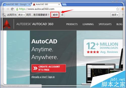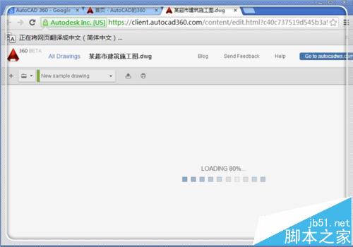 3、出现AutoCAD 360,由于默认的是英文版,但是这个浏览器会提示你是否翻译成中文,如果对英文不习惯,点击“翻译”可转换为中文页面。
