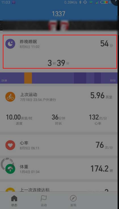 3、稍微在主页界面下拉就看到了昨晚的睡眠状态,点击进去,就可以设置睡眠的时间了。