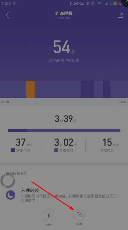 4、进入睡眠菜单后,点击编辑,就会看到入睡的时间睡醒的时间,然后在下方滑动就可以修改睡眠时间,按图二的修改好了后点击保存就修改了睡眠时间。