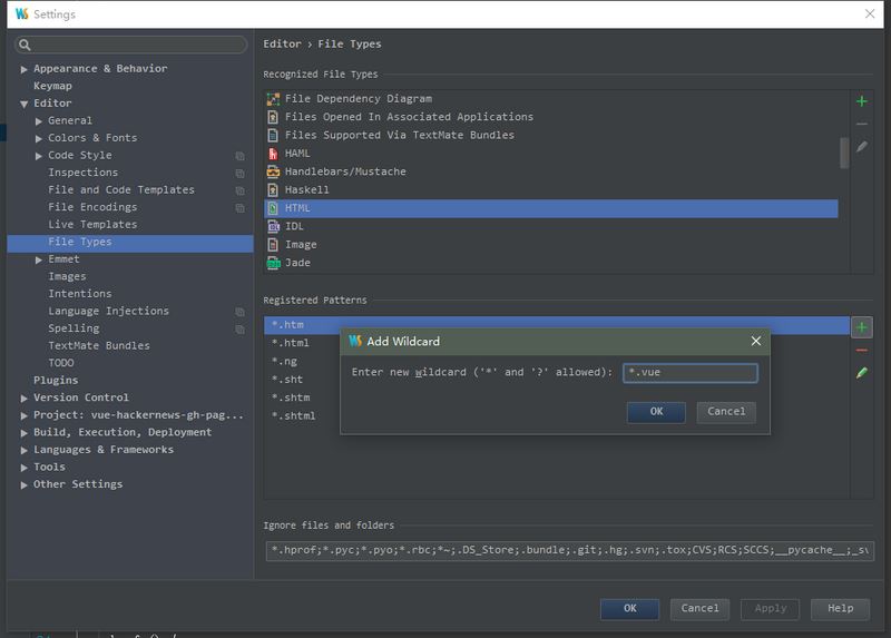 打开 Settings => File Types 找到 HTML 添加 *.vue