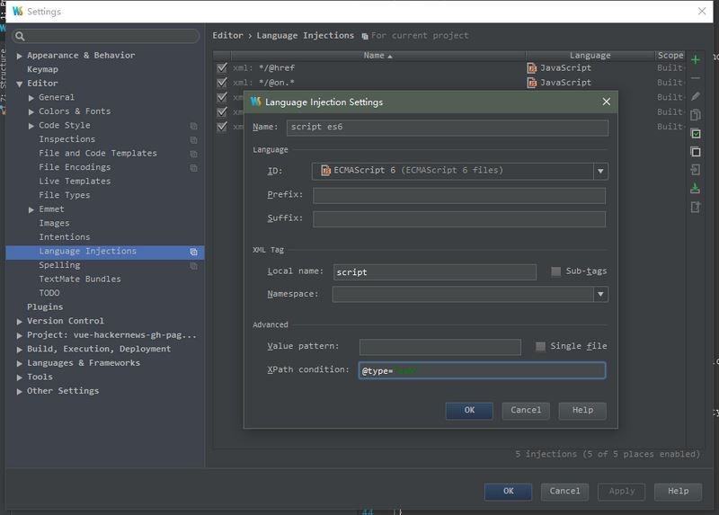 然后打开 Settings => Language Injections 添加 XML Tag Injection,内容如下图。