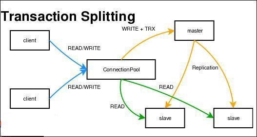MySQL Proxy最强大的一项功能是实现“读写分离(Read/Write Splitting)”。基本的原理是让主数据库处理事务性查询,而从数据库处理SELECT查询。数据库复制被用来把事务性查询导致的变更同步到集群中的从数据库。