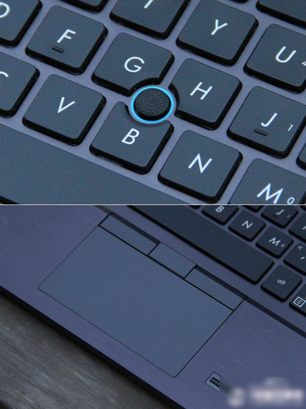 指点杆相信是不少商务用户的最爱,而华硕BU201在键盘中也加入了指点杆的设计,使用起来还是相当准确、方便、流畅的。华硕BU201的触控板设计的也比较独特,触控板上方是三个实体按键,下方则并没有设置按键。触控板的右边是一个指纹识别模块,可守护用户的数据安全。
